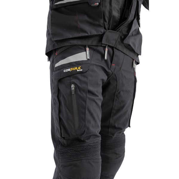Stratul exterior este fabricat din material Cordura rezistent. La fel ca jacheta, pantalonii sunt prevăzuți cu două seturi de panouri asortate în culori care, atunci când sunt desfăcute, dezvăluie o zonă spațioasă de ventilație.